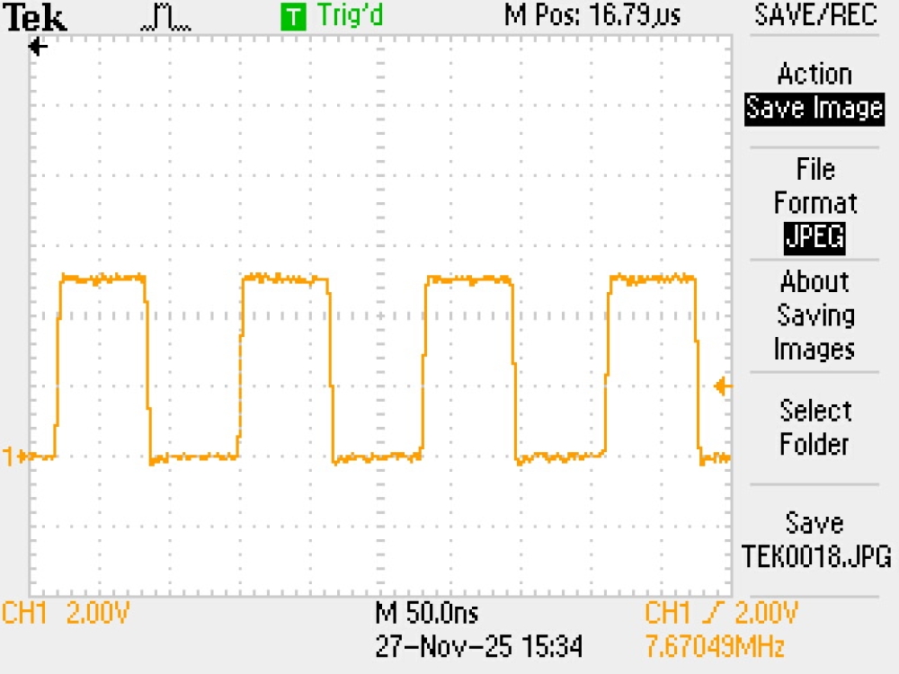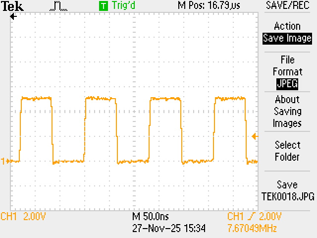 オシロスコープで見た波形は思ったよりきれいに出ていました。表示されている検出された周波数が設定値から少しずれていますが測定精度の問題か測定の仕方なのかなと思います。というのもグラウンドスプリングを使って測定すべきということもそれを使って測定したこともなかったので経験不足、さらにブレッドボードの上で測定しています。