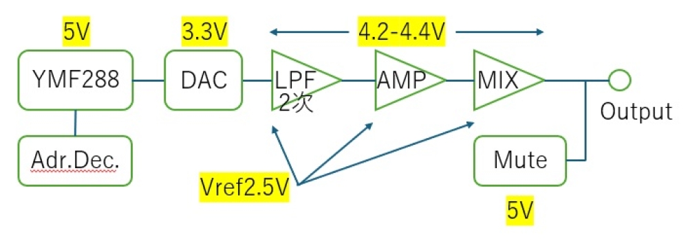 ノイズの対策として電源にLCでローパスフィルタを構成することにしました。秋月電子の1mH 330mA 直流抵抗650mΩです。ここでの電圧降下はできるだけ抑えたく、ちょっと部品としては大きいですが抵抗値の低いのを使ってみます。これでいくらか高い周波数はカットされると期待し、この電源をYMF288とアドレスデコーダ、ミュート制御回路に使います。